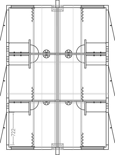 Dette bademodul indeholder 6 separate baderum. Hvert rum har en bruser, en bænk, en hylde og et badeforhæng. Modulet er velegnet til store udendørs arrangementer.
