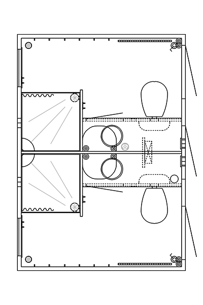 Badmobilen er en perfekt løsning, når der er behov for et badeværelse på farten. Den indeholder to rum, hver med en brusekabine, et toilet med kværn, en bordplade med håndvask, en radiator, et lille vindue samt elektrisk ventilation.
