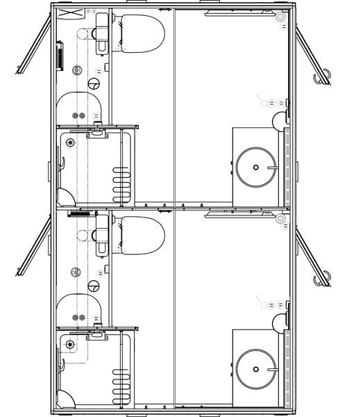 Dette badeværelsesmodul består af to separate rum, som hver er indrettet med toilet, bruser og håndvask. Indretningen har et flot og moderne udtryk med glasvask og lysbaldakin ved håndvasken, som skaber en indbydende atmosfære.