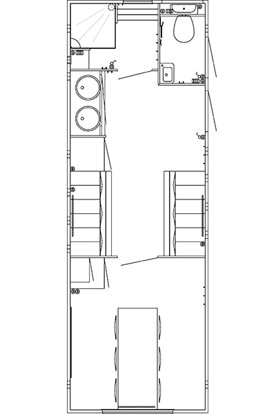 Mandskabsvognen giver dig et rent spiseområde i nærheden af byggepladser med mulighed for bad og omklædning. Vognen indeholder et spiserum, et omklædningsrum med stålskabe, tørreskab og bænk, et vandskyllende toilet med kværn samt et særskilt baderum med bruser, hylder og bænk.