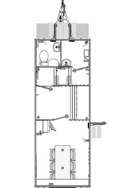 Indretningen består af et urent omklædningsrum, en gennemgangsbruser til dekontaminering samt et rent omklædningsrum med bænk og skabe. Den aktive ventilation med HEPA-filter sikrer effektiv filtrering af luften og bidrager til et sikkert arbejdsmiljø. Derudover er vognen udstyret med toilet med kværn samt et opholdsrum med fast bord og stole, hvilket giver mulighed for pauser og administrative opgaver.