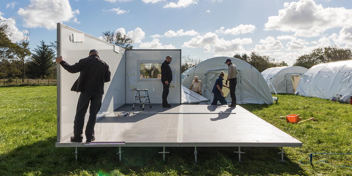 Systemet anvender paneler af samme type, som dem vi bruger til vores skurvogne. De har derfor høj isoleringsevne med glasfiberoverflader, som let kan holdes rene og steriliseres. Gulvet har justerbare fødder, som hjælper med at holde støv og bakterier ude. Systemet kan pakkes i containere eller flatpacks og løftes ud kun ved hjælp af håndkraft.