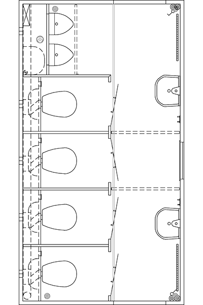 Vores mellemstore toiletvogn tilbyder en god balance mellem kapacitet og fleksibilitet. Vognen leveres standard i tre størrelser og indeholder en kombination af toiletter og urinaler, bortset fra 730 modellen, som kun har toiletter. Vognen har en flytbar skillevæg, så den kan inddeles i to sektioner.